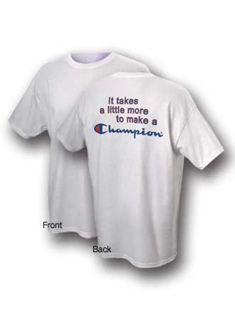- 2-needle stitched bottom and sleeves, C logo left sleeve,Back graphic “It takes a Little More to Make A Champion”.