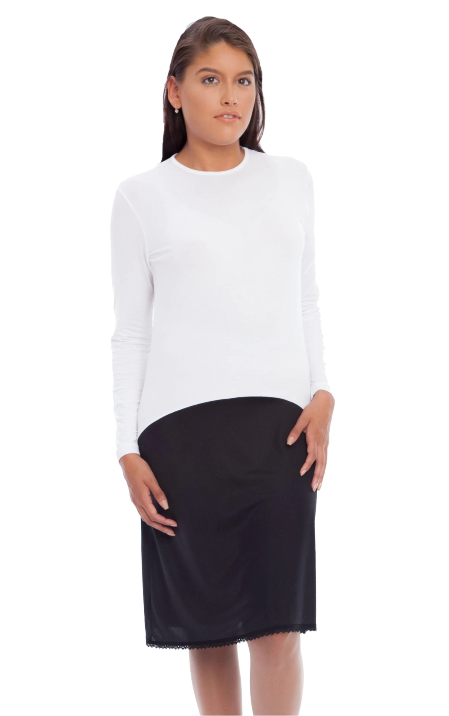 - UNIQUE CONSTRUCTION: This product is designed for versatility and comfort. The seam hits low hip, avoiding visible lines to show through skirt. Round neck and long sleeves, available in many different lengths to fit your needs.