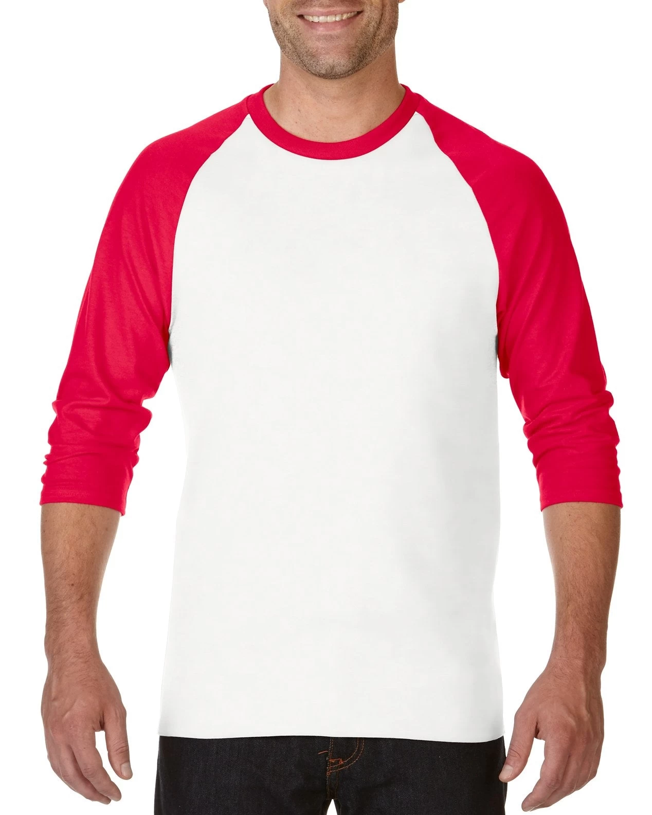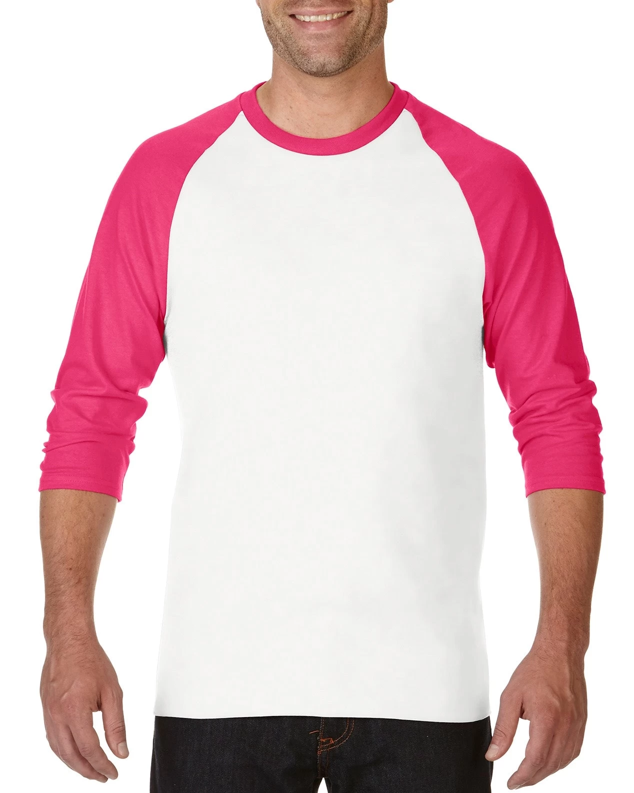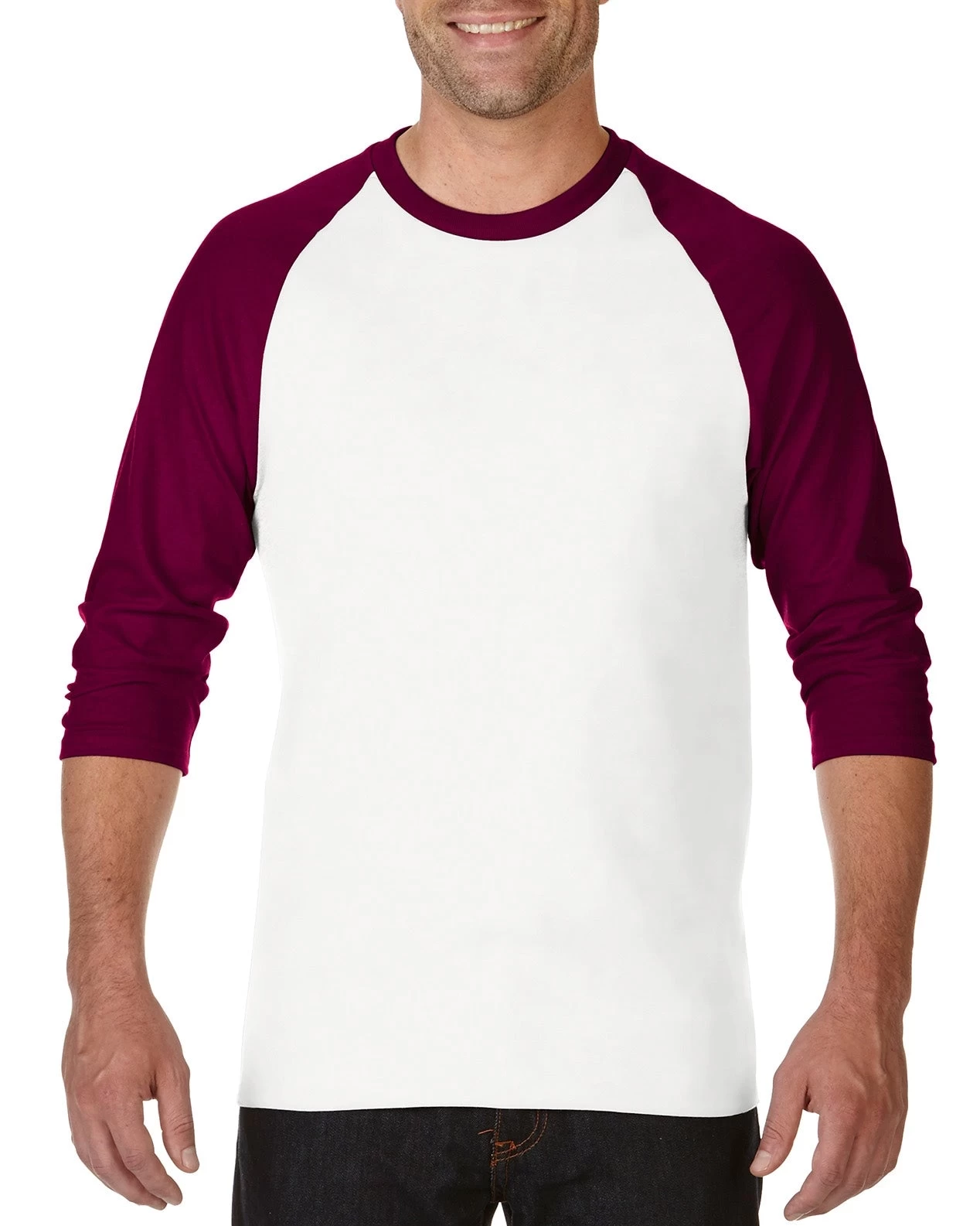 - Contrast color set-in collar and 3/4 raglan sleeves